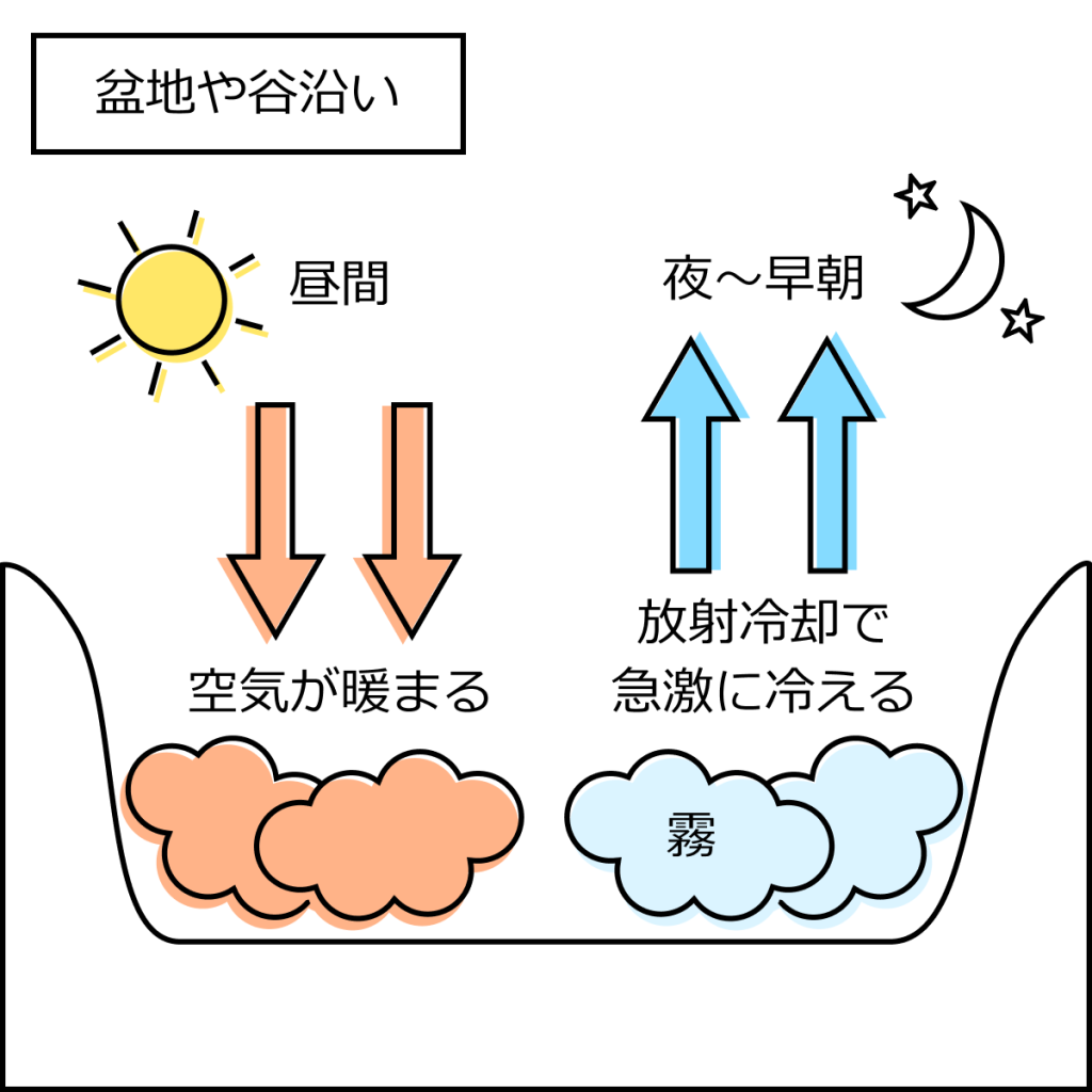 代わって、霧が出やすくなる舞台は盆地や谷沿い。秋、早朝の急激な冷え込みが、空気を霧に変身させます。秋の霧は、夜間に地上から熱が逃げる放射冷却を可視化する、気温を正直に映し出す存在です。冬に近づくと霧は発生しなくなり、代わりに霜として姿を見せます。冷え込みが氷点下に達した合図です。