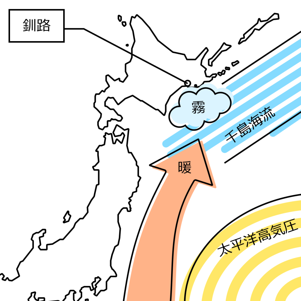 釧路の霧は、海の上で生まれます。太平洋高気圧による夏の暖かい空気が、冷たい千島海流で冷やされて霧となり、釧路の街を幻想的に包み込むのです。太平洋高気圧の勢力が弱まり、霧の発生が減っていくと夏も終幕。