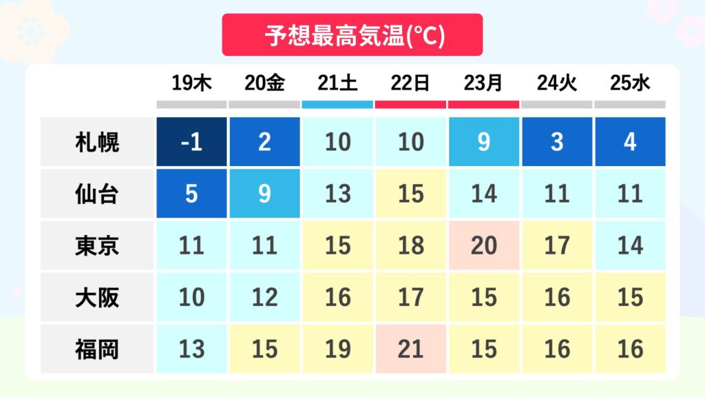 福岡では22日(日)に21度、東京は23日(月・祝)に20度と、各地今年一番の暖かさになる予想です。昼間のお出かけには上着いらずとなるかもしれません。