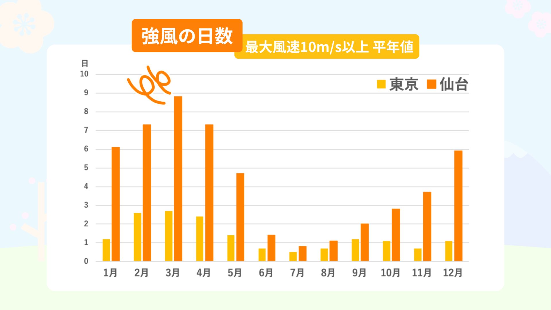 例えば東京や仙台の最大風速10m/s以上の強風日数の統計をみると、1年のうち3月が最も多くなっています。