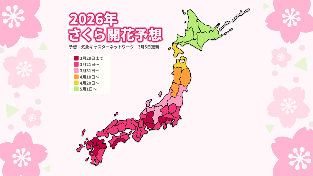 きのう(5日)発表の気象庁1ヶ月予報によると、4月初めにかけて全国的に気温は平年並みか高い予想です。この暖かさが、さくらのツボミの成長を後押しし、さくら開花は全国的に平年より早くなる見込みです。この冬は1月から寒くなった時期があり、さくらの開花に必要な「休眠打破」は順調に進んでいるとみられています。