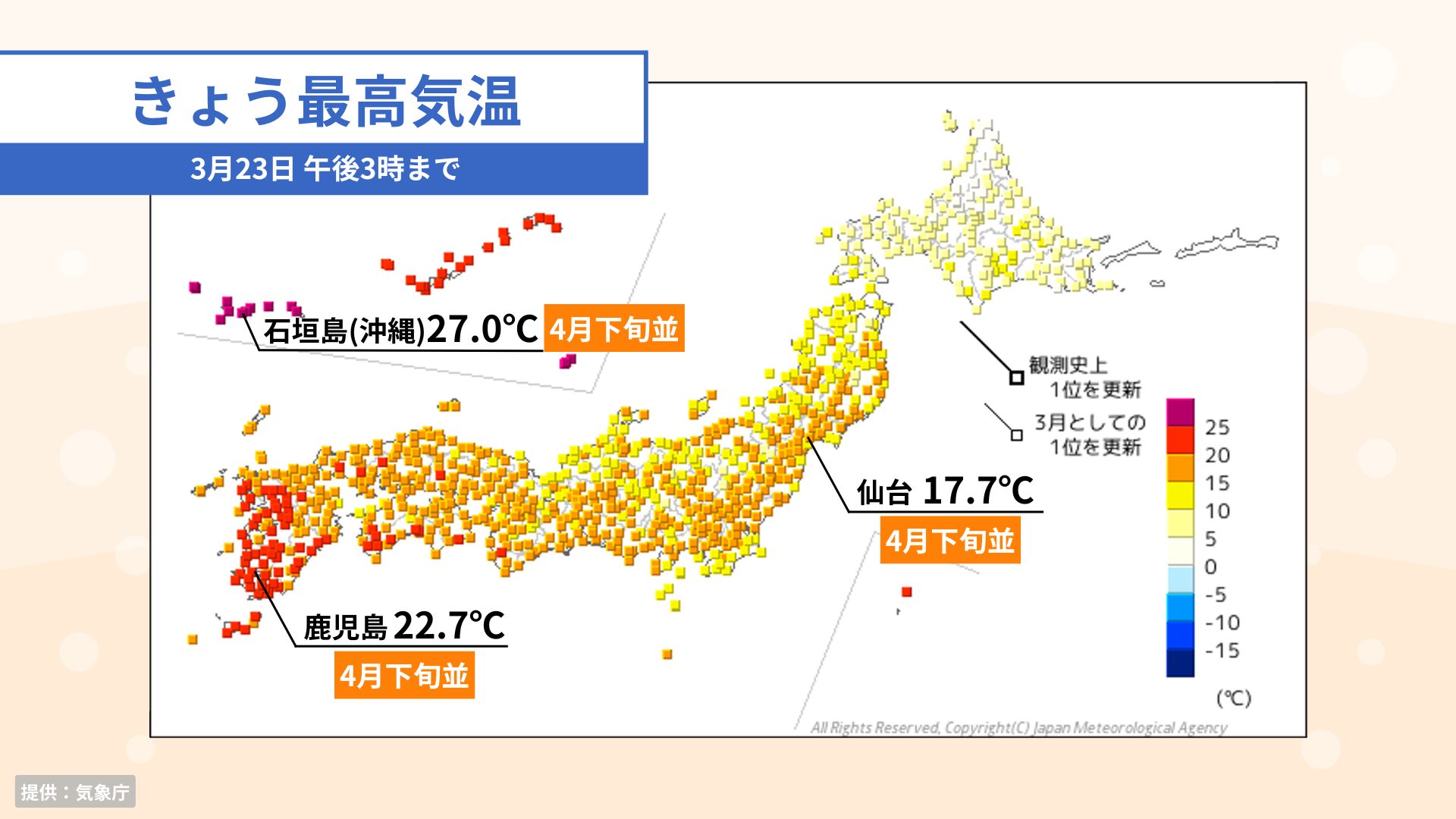 東北や九州・沖縄では軒並み今年最高の気温を記録し、仙台や鹿児島、石垣島(沖縄)では4月下旬並みの陽気に。