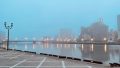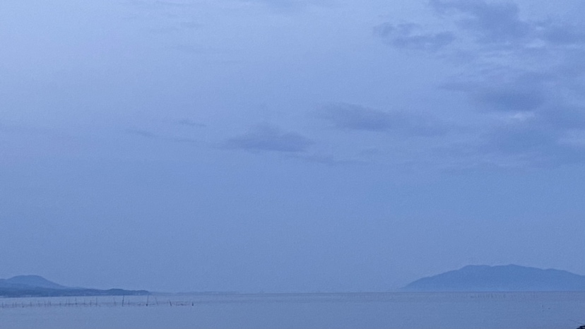 群青色の世界の中、うっすらと朝もやがたなびく宍道湖のようすです。