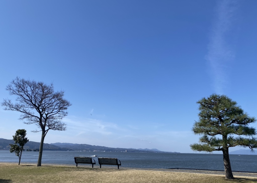 湖岸の公園に設置されたベンチに座って眺めれば、