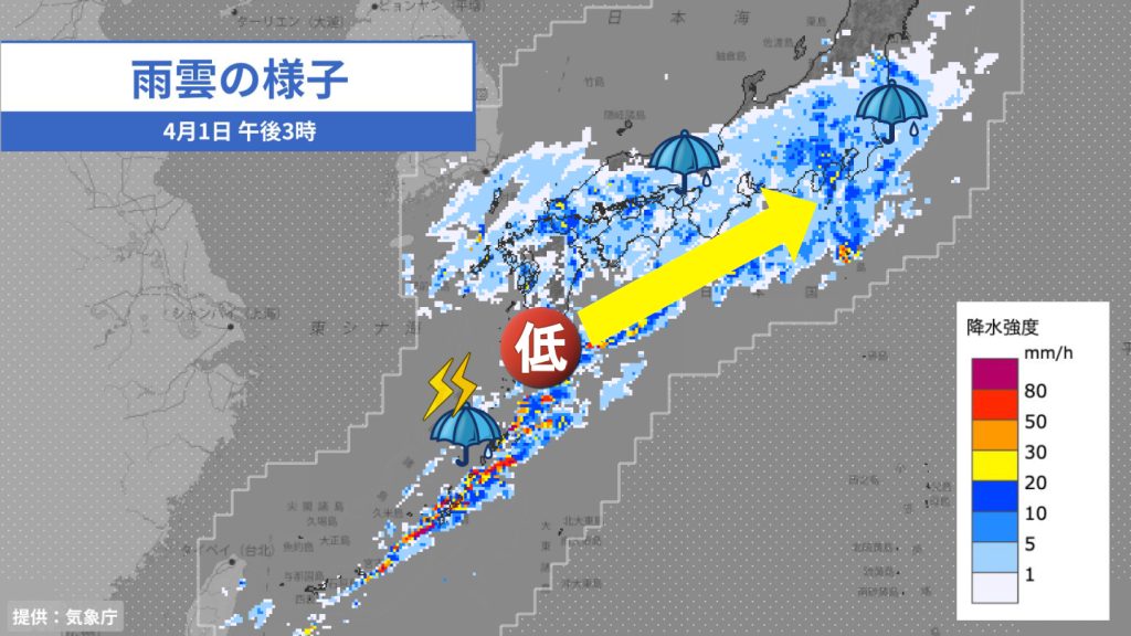 新年度スタートのきょう(1日)は、低気圧の影響で、広い範囲で雨が降っています。