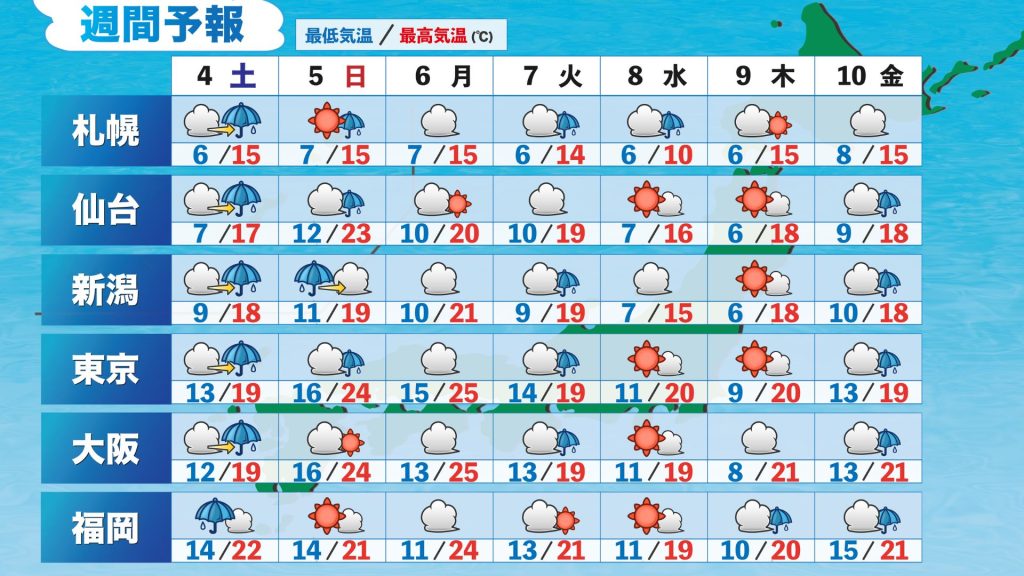 来週は春らしく周期的に天気が変わり、数日おきに雨が降る見込みです。西日本・東日本ではそろそろ葉桜になってしまう所が多いかもしれません。一方で気温の高い傾向が続き、桜前線は平年よりかなり早く北日本を北上しそうです。