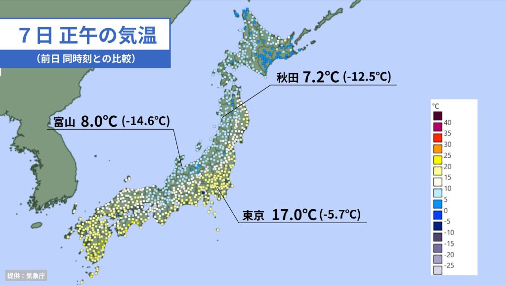 正午の気温は、北海道から北陸にかけては10℃に届かず、初夏の陽気となった前日(6日)より10℃以上も低くなっているところがあります。