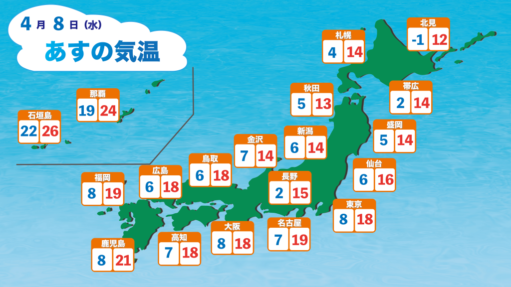 この寒気の流れ込みは続かず、あす(8日)日中は過ごしやすい陽気となりますが、朝との気温差が大きくなり、服装選びは難しくなりそうです。