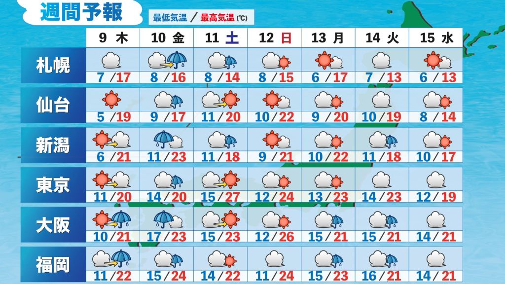 きょう(8日)は全国的に晴れて、朝は内陸部を中心に放射冷却で冷え込みました。一方で日中は日差しで気温が上昇、朝と日中の気温差が20℃以上になった所もありました。今の季節は朝に厚着をし過ぎると日中は荷物になってしまい服装選びが難しいですね。大きな寒暖差は体調不良の原因にもなりますのでご注意ください。