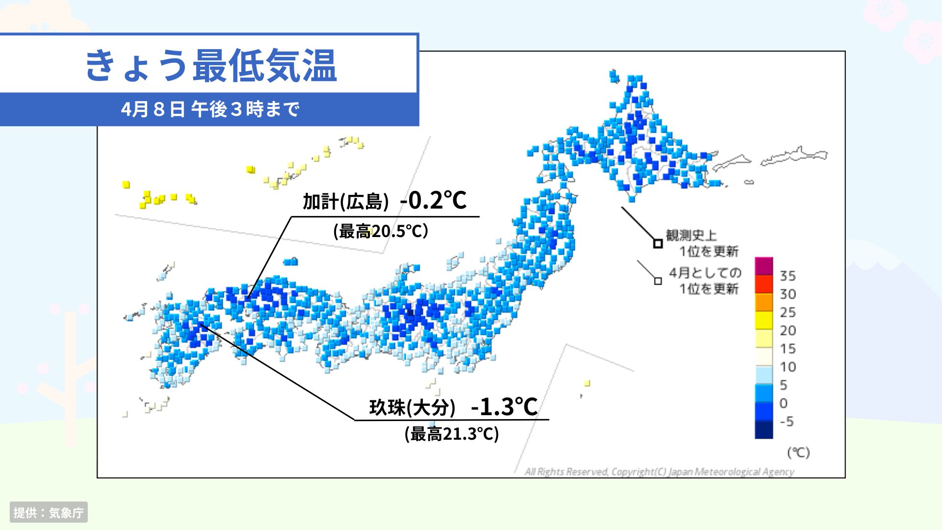 きょう(8日)は全国的に晴れて、朝は内陸部を中心に放射冷却で冷え込みました。一方で日中は日差しで気温が上昇、朝と日中の気温差が20℃以上になった所もありました。今の季節は朝に厚着をし過ぎると日中は荷物になってしまい服装選びが難しいですね。大きな寒暖差は体調不良の原因にもなりますのでご注意ください。